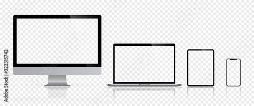 Wall mural : Realistic set of computer monitors desktop laptop tablet and phone reflect with checkerboard screen