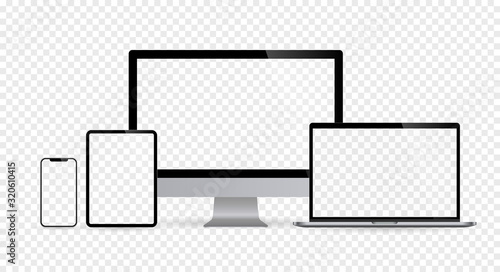 Wall mural : Realistic set of computer monitors desktop laptop tablet and phone with checkerboard screen and back
