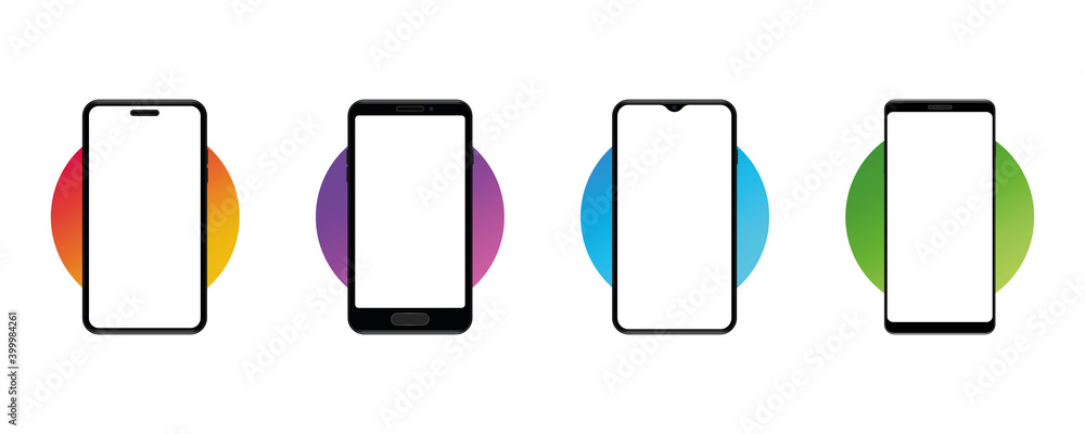 Wall mural realistic smartphone mockup devices on colored circle background. blank, empty screen. template for