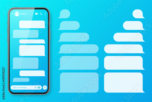 Realistic smartphone with messaging app on colorful blue background - blank sms text frame - chat screWall mural