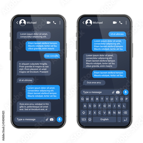 Wall mural realistic smartphone with messaging app. sms text frame. conversation chat screen with blue message  - Wall murals Wall mural realistic smartphone with messaging app. sms text frame. conversation chat screen with blue message - Wall murals