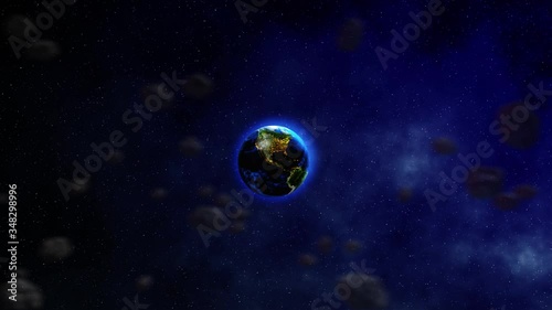 Wall mural realistic space animation with a rotating moon around the blue planet earth with flying asteroids an