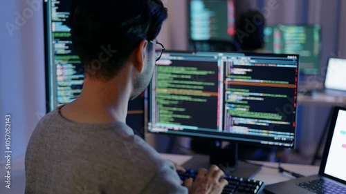 Wall mural : Rear view of a male programmer working on multiple monitors filled with code, highlighting a late wo