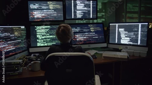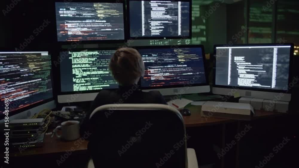 Wall mural rear view of female hacker sitting in the dark office in front of six monitors with data and typing  - Wall murals Wall mural rear view of female hacker sitting in the dark office in front of six monitors with data and typing - Wall murals