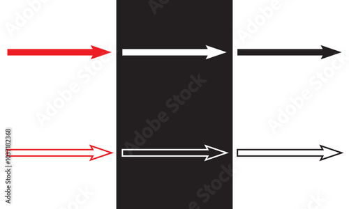 Wall mural red, black and white large forward or pointing solid long arrow icon sketched as vector symbol . vec