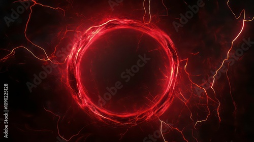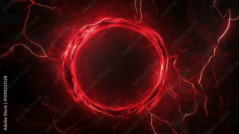 The watermark will not be included on Wall mural.: Red abstract circle plasma lightning particle effect, ring with swirling glow particles visual effec