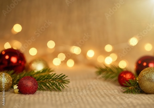 Wall mural red and gold christmas ornaments lie on a soft surface with fir branches and glowing string lights p - Wall murals Wall mural red and gold christmas ornaments lie on a soft surface with fir branches and glowing string lights p - Wall murals