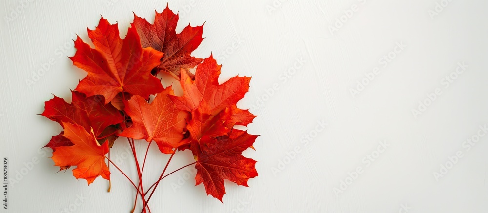 The watermark will not be included on Wall mural.: Red and orange maple leaves in a bouquet arrangement with a white backdrop providing copy space for