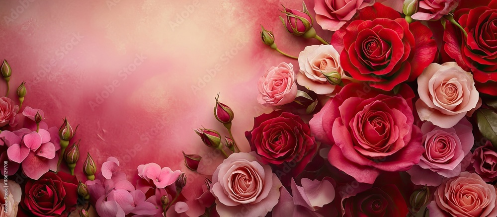 Wall mural red and pink roses with a backdrop of flower buds. with copy space image. place for adding text or d