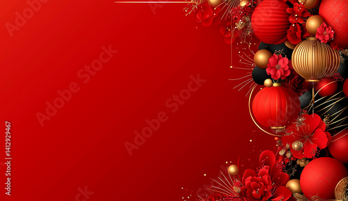 Wall mural red background with gold accents and red and black lanterns. the lanterns are arranged in a way that - Wall murals Wall mural red background with gold accents and red and black lanterns. the lanterns are arranged in a way that - Wall murals