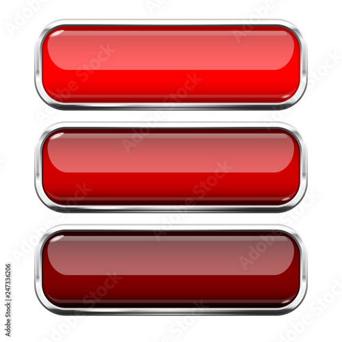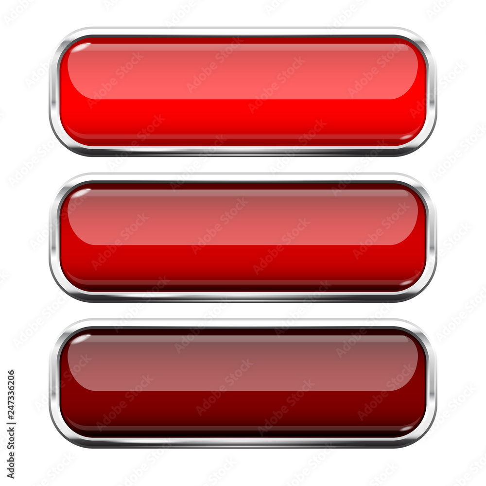 Wall mural red glass buttons. web 3d shiny rectangle icons with chrome frame