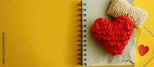 Wall mural : Red heart shaped woolen toy and torn notebook sheet on yellow paper with a copy space image