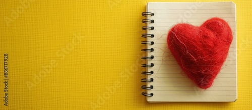 Wall mural : Red heart shaped woolen toy and torn notebook sheet on yellow paper with a copy space image