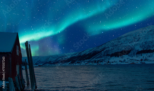 Wall mural : Red house covered with layers of snow - aurora borealis in tromso, norway in front of the norwegian