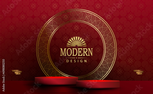 The watermark will not be included on Wall mural.: Red illustration with a round podium and a golden round frame with a pattern -