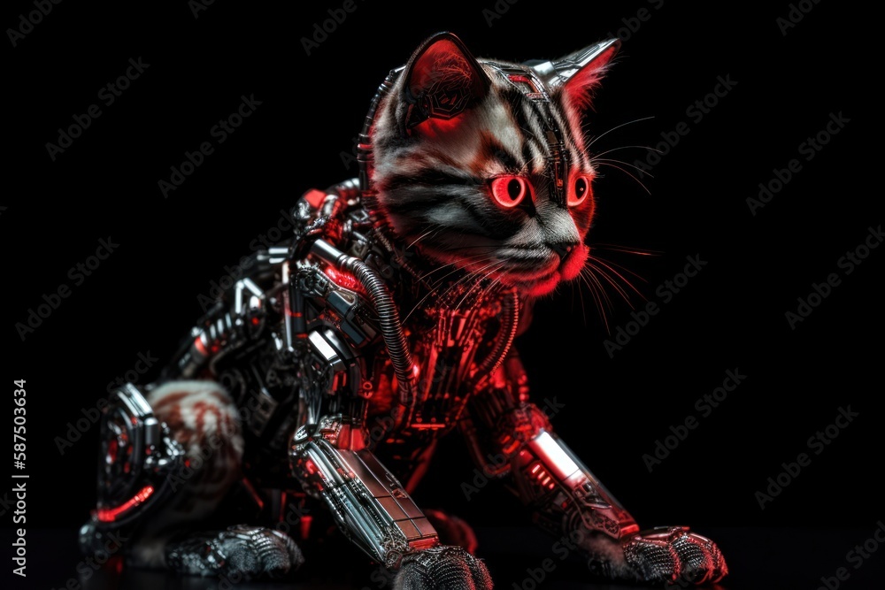 Wall mural : Red kitten mechanical robotic creature on black background generative ai