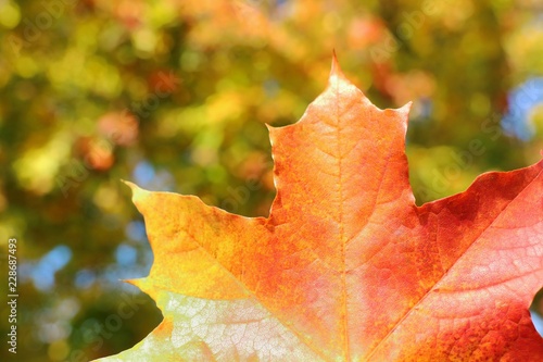 The watermark will not be included on Wall mural.: Red maple leaf with blurred of colorful tree leaves background - nature in autumn background concept -