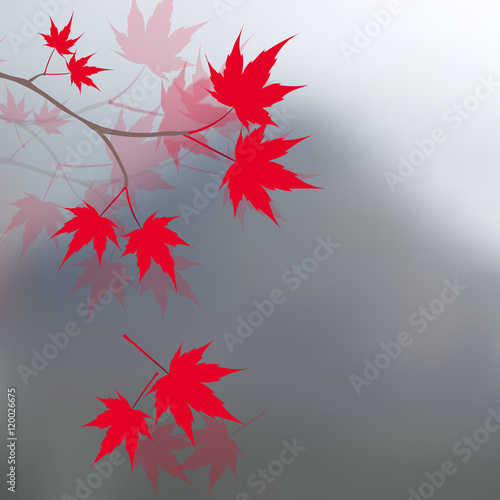 Wall mural red maple leaves on the branches. japanese red maple on a background of mountains in the mist. lands - Wall murals Wall mural red maple leaves on the branches. japanese red maple on a background of mountains in the mist. lands - Wall murals