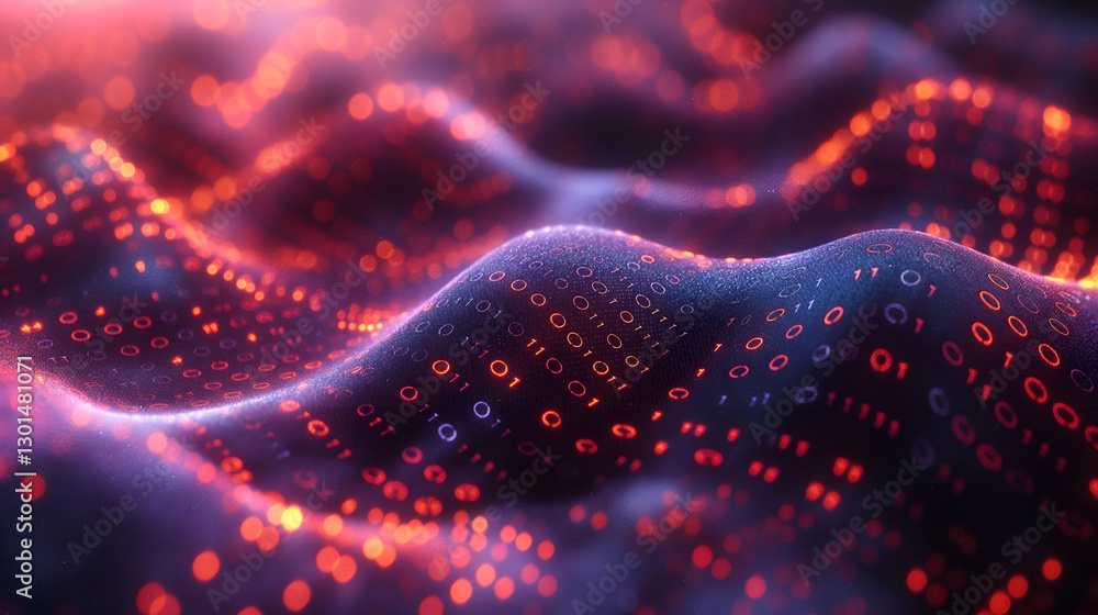 Wall mural red orange digital wave binary code glow, cyber future design for network science - Wall murals Wall mural red orange digital wave binary code glow, cyber future design for network science - Wall murals