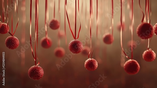 The watermark will not be included on Wall mural.: Red ornaments hang from strings, creating a festive atmosphere with a soft, glowing background, idea