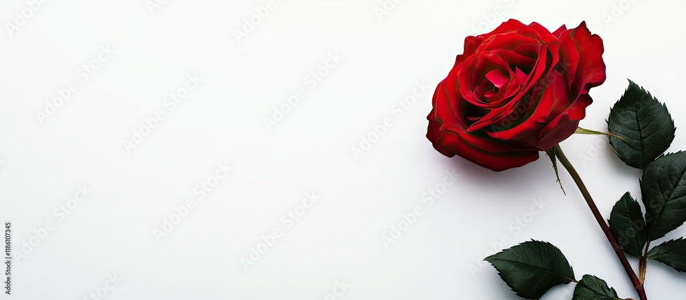 The watermark will not be included on Wall mural.: Red rose in full bloom on white card - with copy space image - place for adding text or design