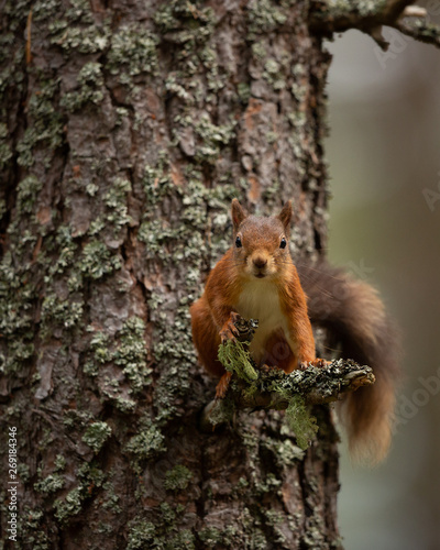 Wall mural red squirrel perched on a small branch up a tree with bark behind it.