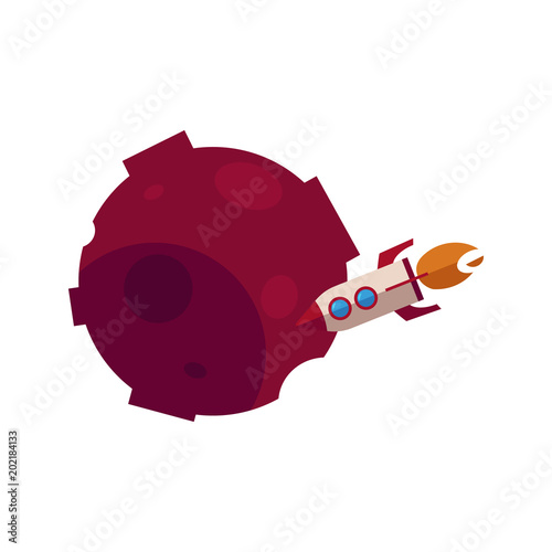 Red stone planet, comet or satellite with rocket spaceship icon - flat asteroid meteor with craters - Wall mural