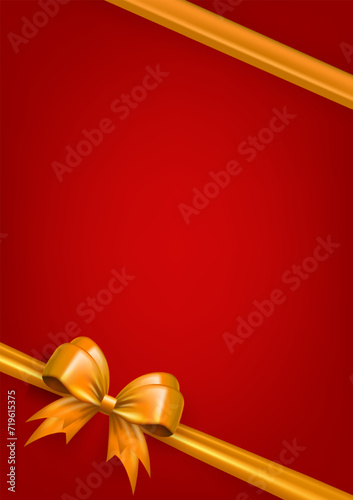 Wall mural : Red vertical banner with golden realistic 3d bow and empty space for text - three dimensional silk ye
