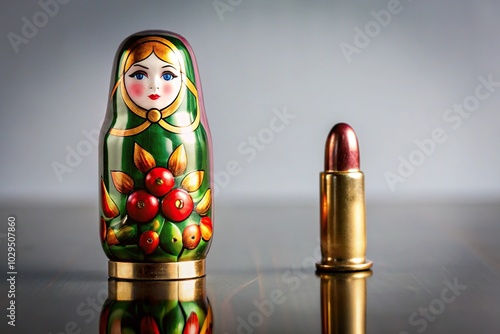 Wall mural : Reflected visualization of nesting doll with bullet in focus
