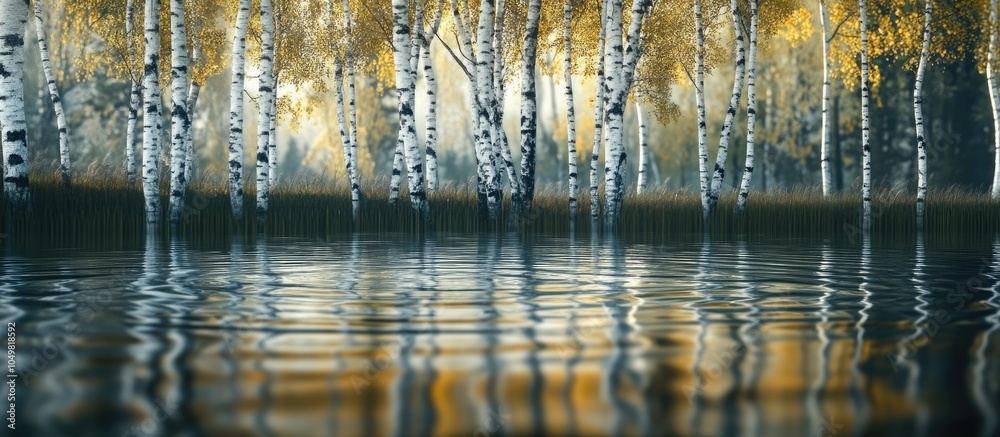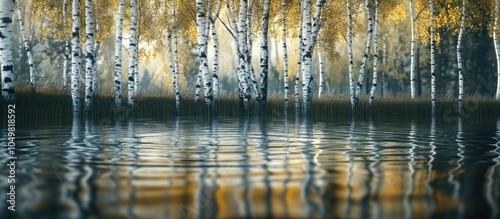 The watermark will not be included on Wall mural.: Reflection of a birch grove on the lake with ripples - with copy space image - place for adding text o