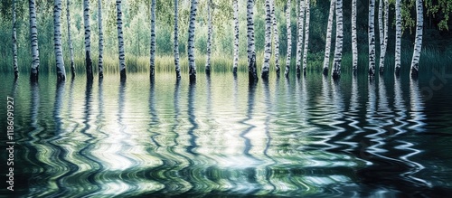 The watermark will not be included on Wall mural.: Reflection of a birch grove on the lake with ripples - with copy space image - place for adding text o