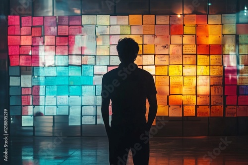 Wall mural reflection of a viewer before a colorful wall of notes in an urban setting during evening hours - Wall murals Wall mural reflection of a viewer before a colorful wall of notes in an urban setting during evening hours - Wall murals