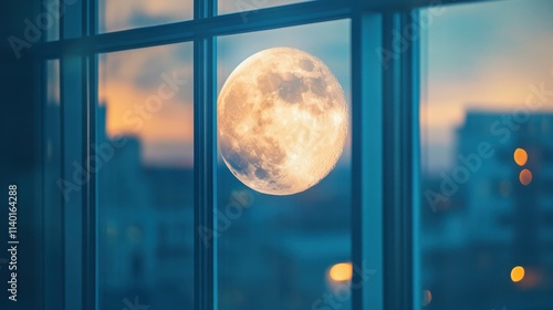 The watermark will not be included on Wall mural.: Reflection of the moon in a large glass window, sharp and dynamic composition, serene and peaceful a