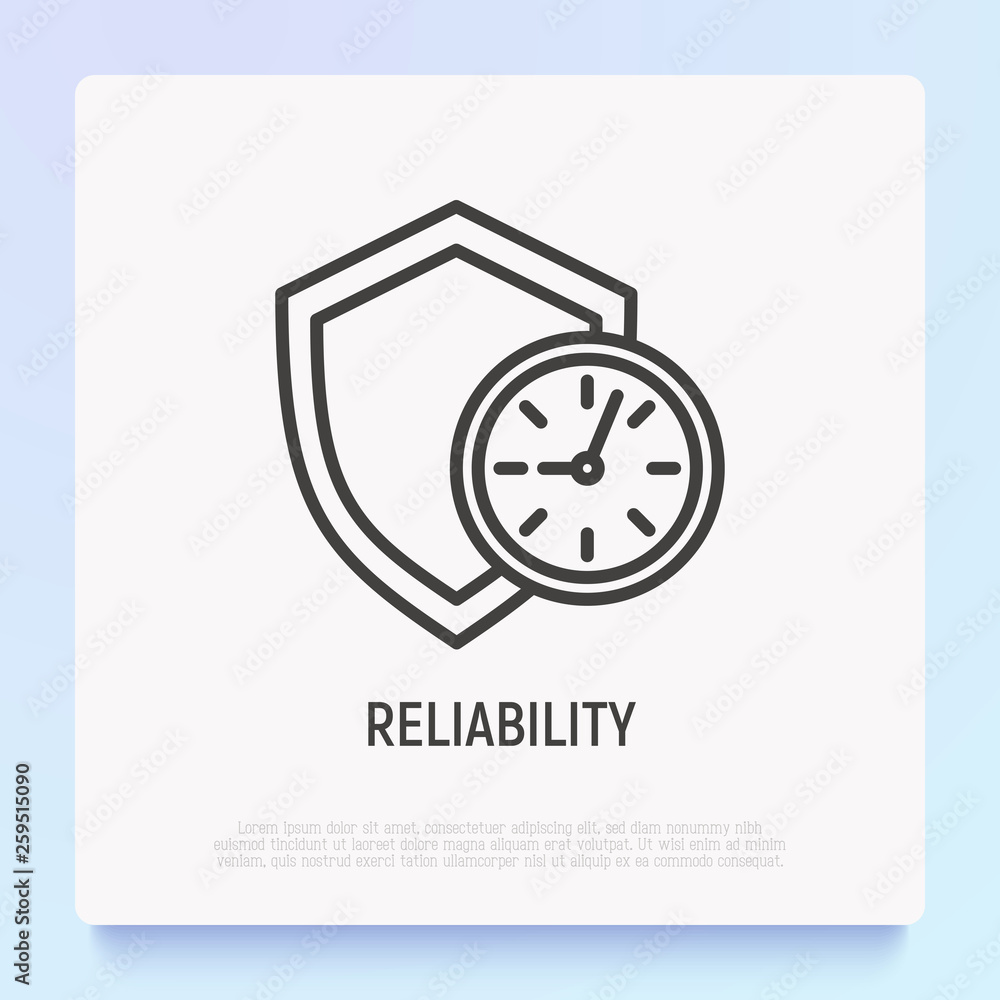 Reliability thin line icon: shield with clock - symbol of support - modern vector illustration - Wall mural