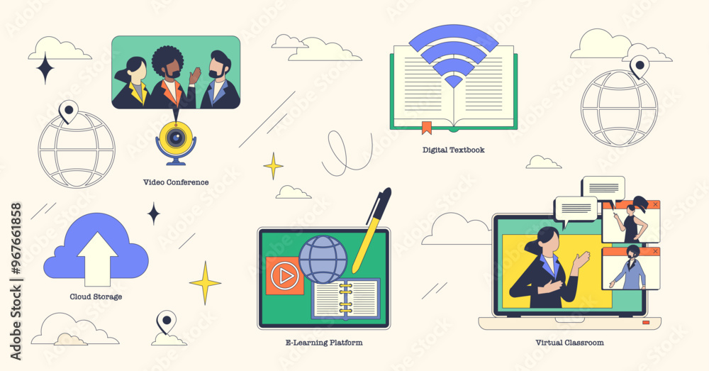 Wall mural remote learning and platform for digital study tiny neubrutalism collection. labeled elements with o