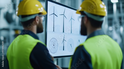 The watermark will not be included on Wall mural.: Renewable energy wind turbine with a group of engineers discussing wind turbine design plans in a hi