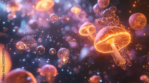 The watermark will not be included on Wall mural.: Representation of fungi evolving to survive in a gamma ray rich outer space environment glowing levi