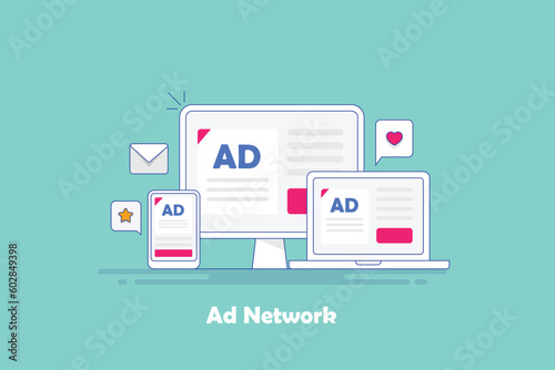 Wall mural : Responsive ads on smartphone, laptop and computer screen - digital ad network connecting business to
