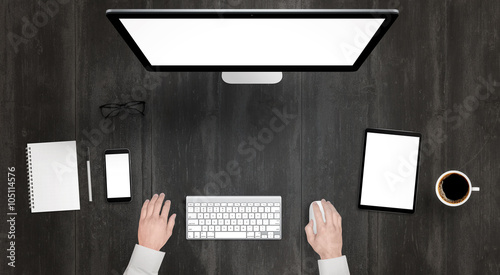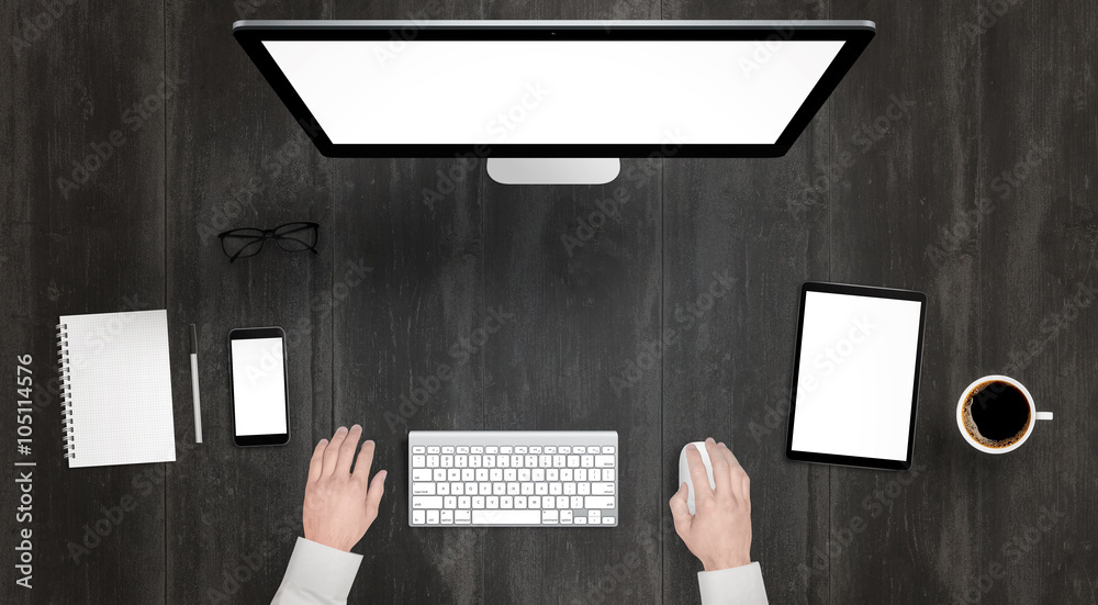 Responsive devices with isolated screen for mockup - top view of modern desk with computer display, pWall mural