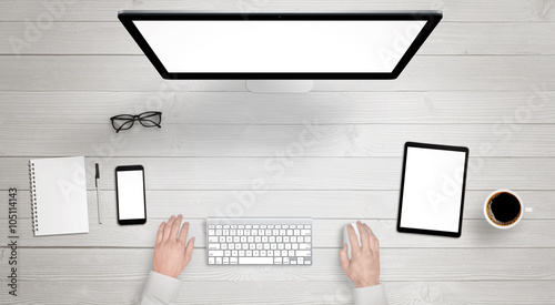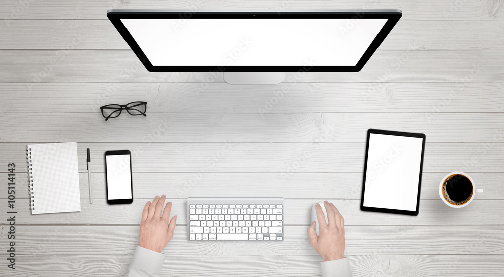 Responsive devices with isolated screen for mockup - top view of modern desk with computer display, pWall mural