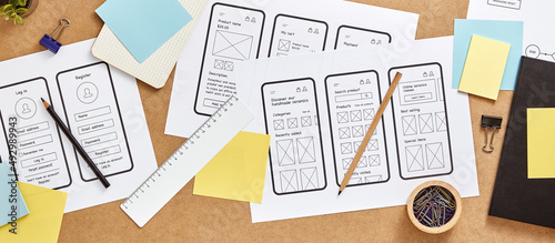Wall mural responsive web design concept banner. web ux designer busy desk with numerous mobile app wireframe s - Wall murals Wall mural responsive web design concept banner. web ux designer busy desk with numerous mobile app wireframe s - Wall murals