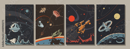 Wall mural retro future style space illustration set, spacecraft, rockets, orbital station, planets
