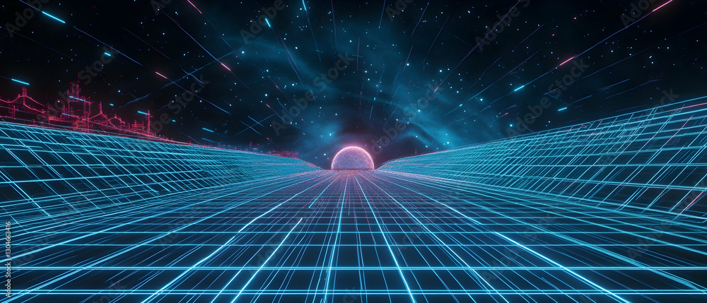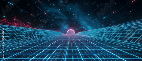 The watermark will not be included on Wall mural.: Retro futuristic design with perspective grid and wireframes, cyberpunk style -