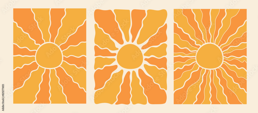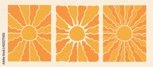 Wall mural retro groovy sun background set. abstract wave ray pattern in trendy 70s style. boho colorful groovy