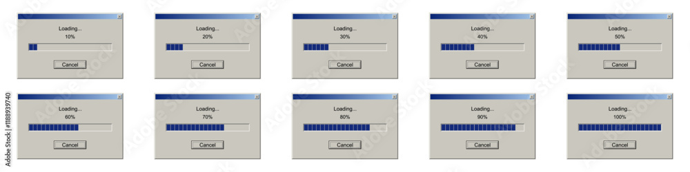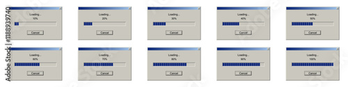 The watermark will not be included on Wall mural.: Retro interface window with download and different loading percentages - set of alerts windows on com