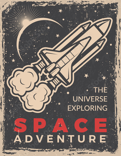 The watermark will not be included on Wall mural.: Retro poster with space shuttle - design template with place for your text