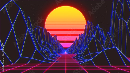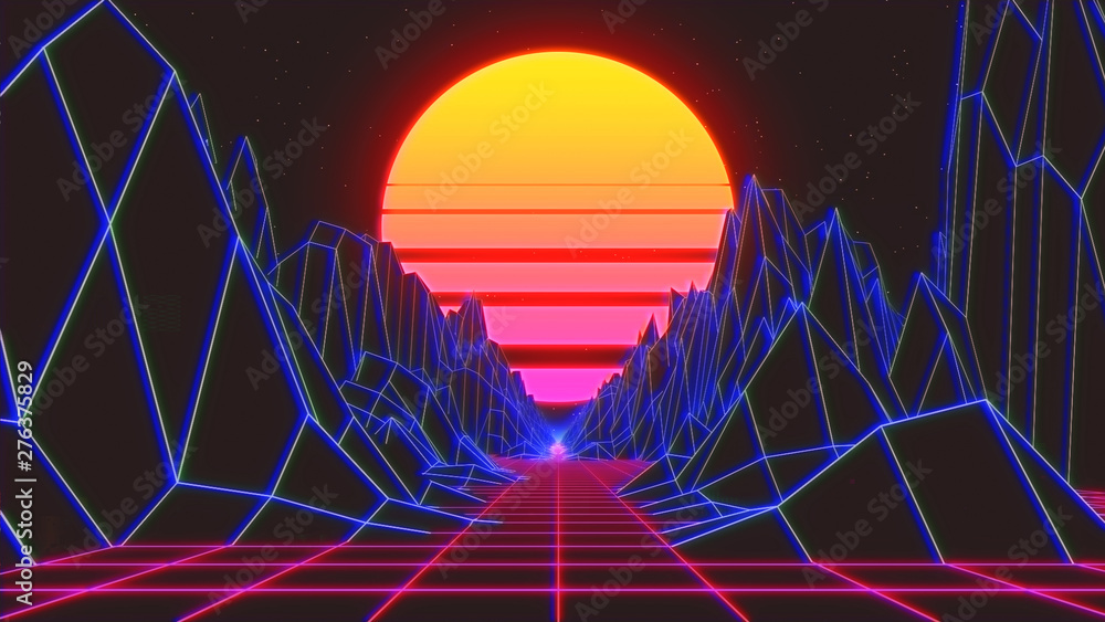 The watermark will not be included on Wall mural.: Retro radial sun rising abstract with a background neon 3d prescriptive bridge or grid render - illu