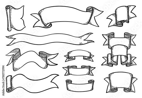 Wall mural retro ribbons. banner flag different forms with copy space for text, old hand draw scroll curve labe
