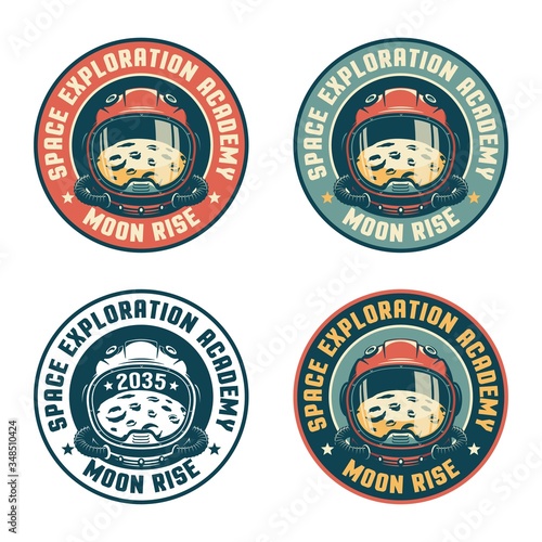 Wall mural retro space badge with astronaut helmet and moon. vintage spaceman emblem with planet. vector illust