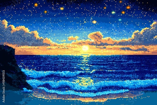 Wall mural : Retro-style 8-bit pixel art depicting a serene sea under a starlit sky -